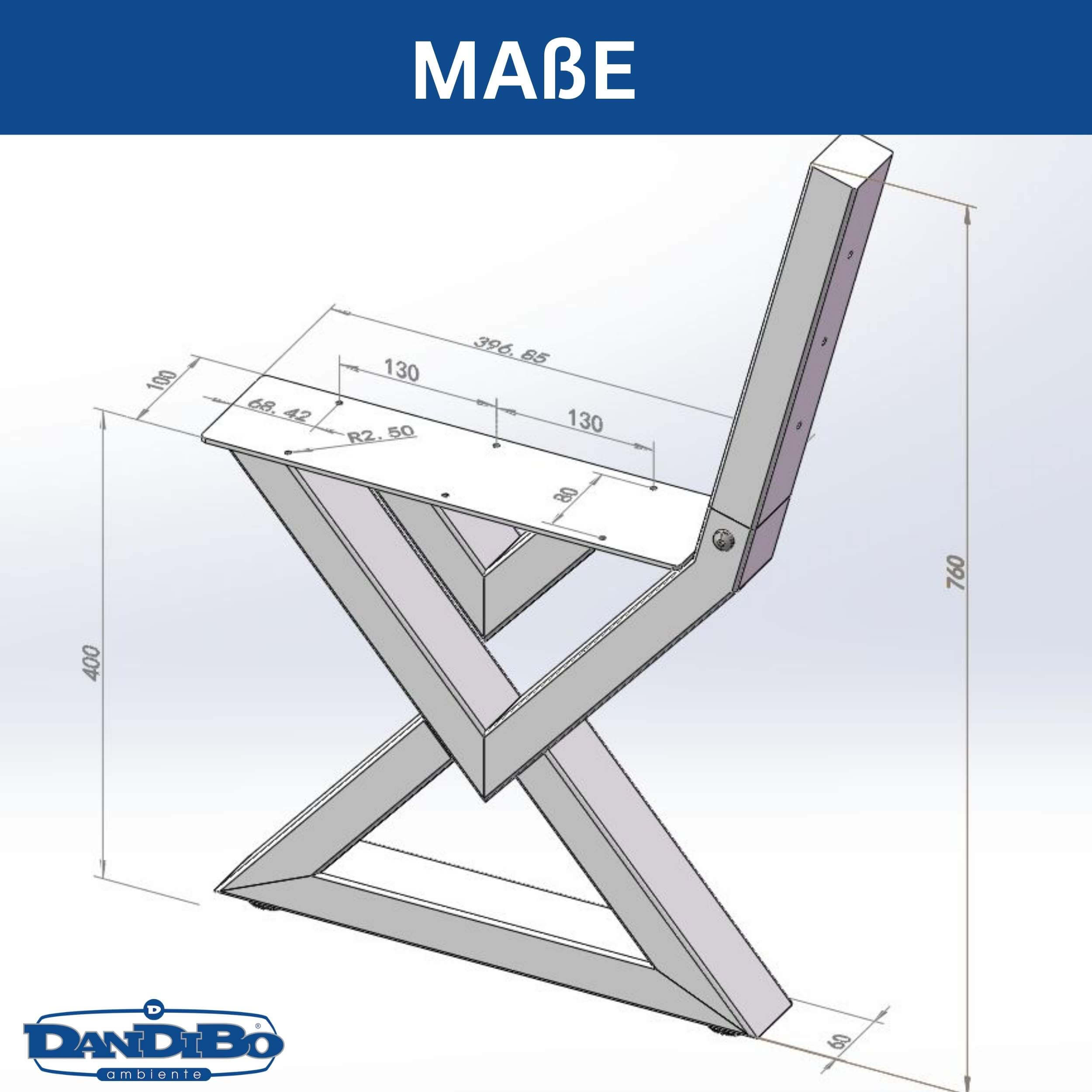 ABMESSUNGEN & DETAILS – Gesamthöhe: ca. 76 cm, Sitzhöhe: ca. 40 cm, Tiefe unten: ca. 45 cm. Profilmaß: ca. 4 × 6 cm. Wandstärke: 1,5 mm. Gewicht: ca. 6 kg pro Bein. Material: Edelstahl. Lieferumfang: 1 Set Bankbeine (2 Stück, ohne Holz).