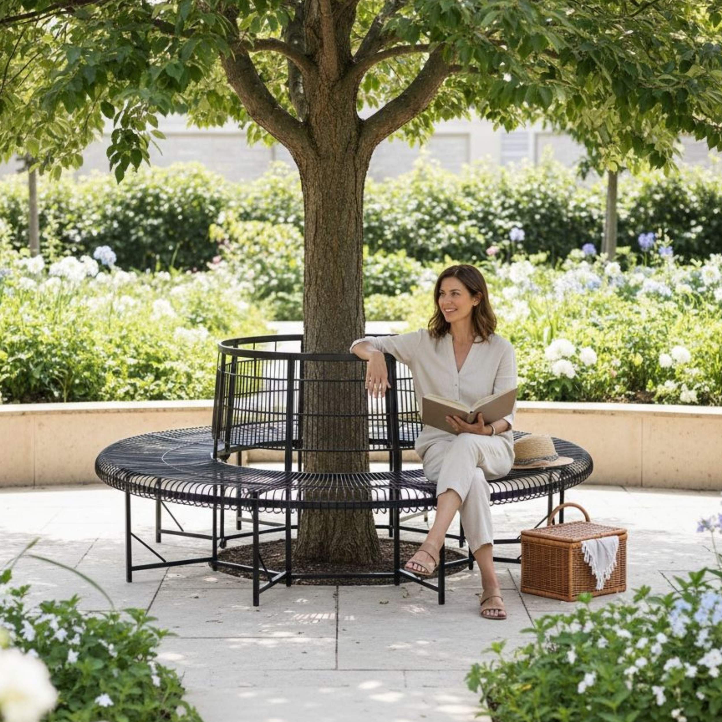 Die runde Sitzfläche bietet viel Platz zum Entspannen, Lesen oder Verweilen im Schatten des Baumes. Dank der offenen Konstruktion wird der Baumstamm stilvoll umrahmt, ohne ihn einzuengen, und mehrere Personen können bequem gleichzeitig Platz nehmen.