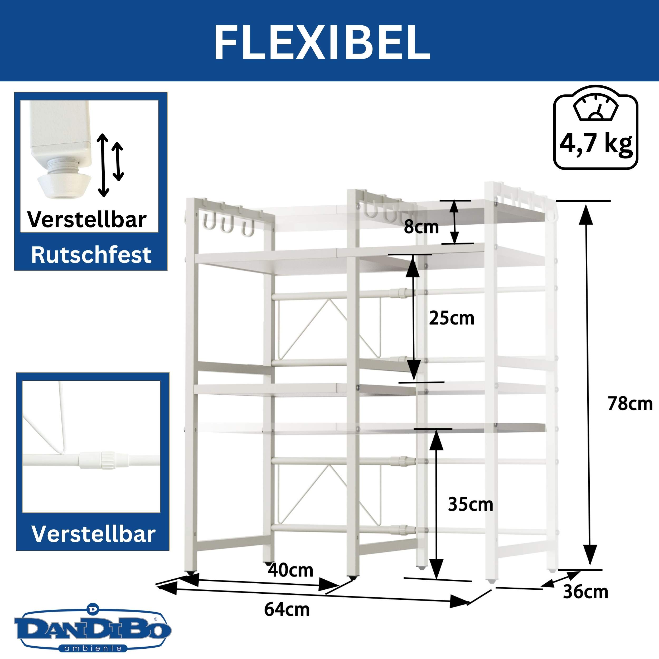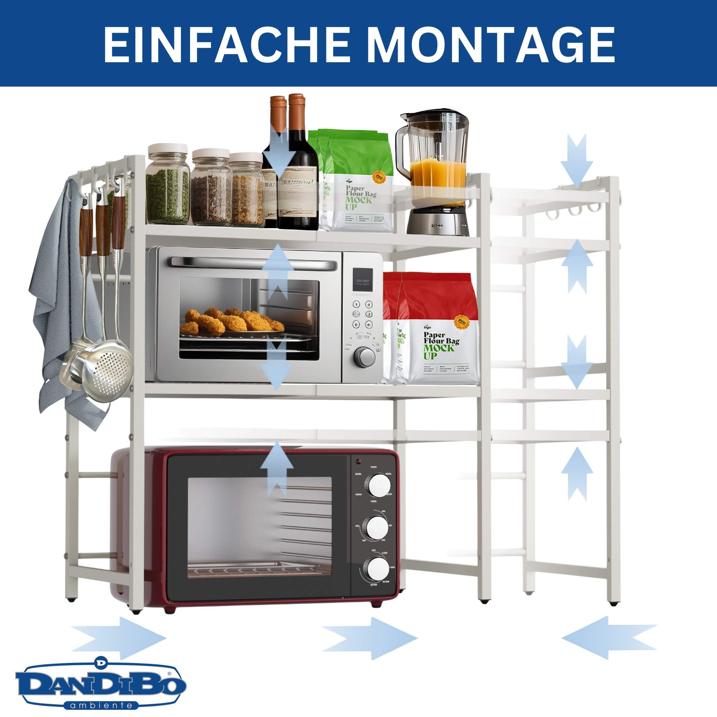 GRÖSSE FLEXIBEL EINSTELLBAR: Das Mikrowellenregal bietet maximale Flexibilität: Die Breite kann zwischen 40 cm und 64 cm variiert werden, während die Ablagenhöhen individuell einstellbar sind. Die 2. Ebene lässt sich zwischen 30 cm und 40 cm und die 3. Ebene zwischen 25 cm und 35 cm einstellen, um den verfügbaren Platz optimal zu nutzen.