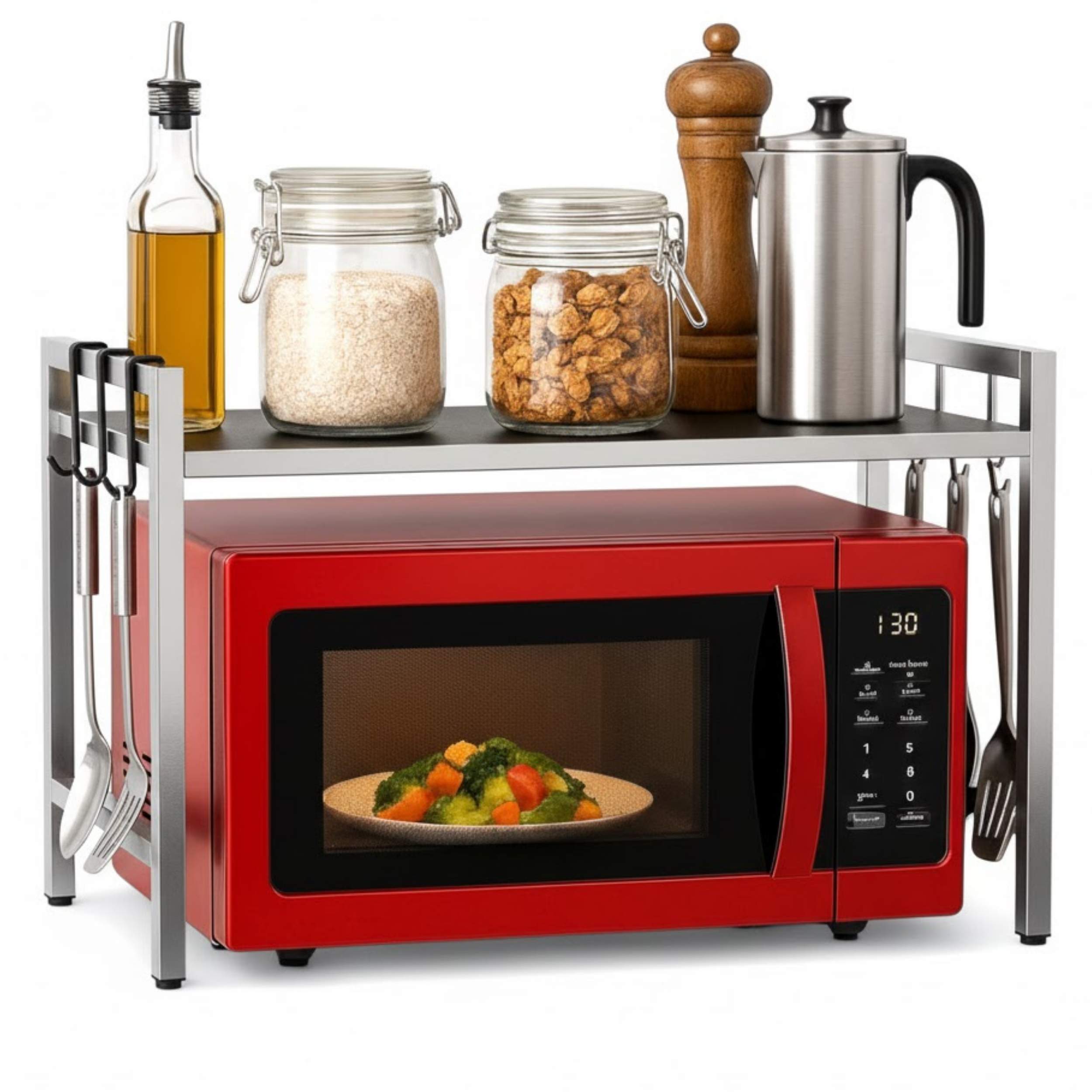 ABMESSUNGEN & DETAILS – Breite: 40–64 cm, Höhe: 46 cm, Tiefe: 36 cm. Material: Edelstahl, Farbe: Silber, Gewicht: ca. 3,2 kg. Lieferumfang: Küchenregal inkl. 8 Haken (ohne Geräte & Dekoration).