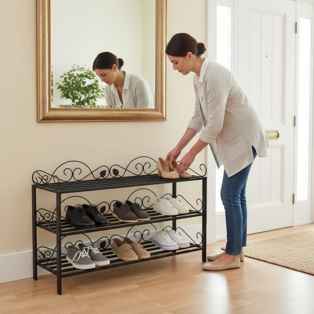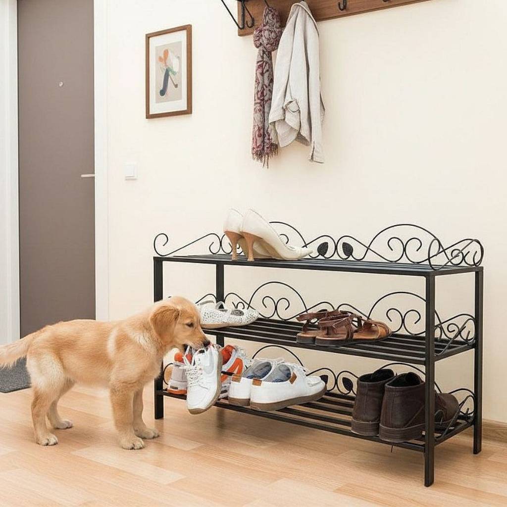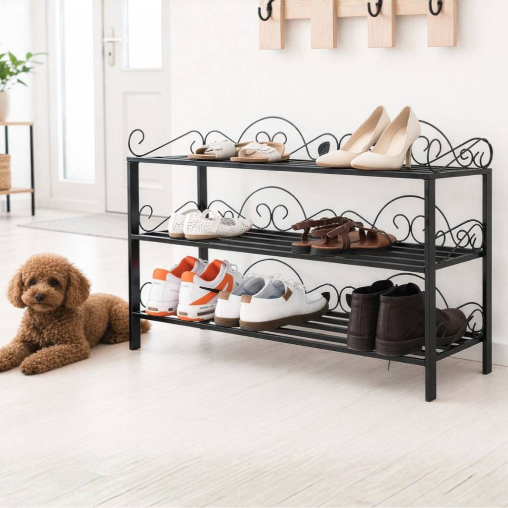 DEKORATIVER SCHUHSTÄNDER AUS METALL: Dieses Schuhregal mit 3. Etagen überzeugt durch sein elegantes, geschwungenes Design mit dekorativen Verzierungen und wird zum echten Blickfang in Ihrem Flur. Es passt perfekt in den Eingangsbereich und sorgt für eine stilvolle und aufgeräumte Atmosphäre.