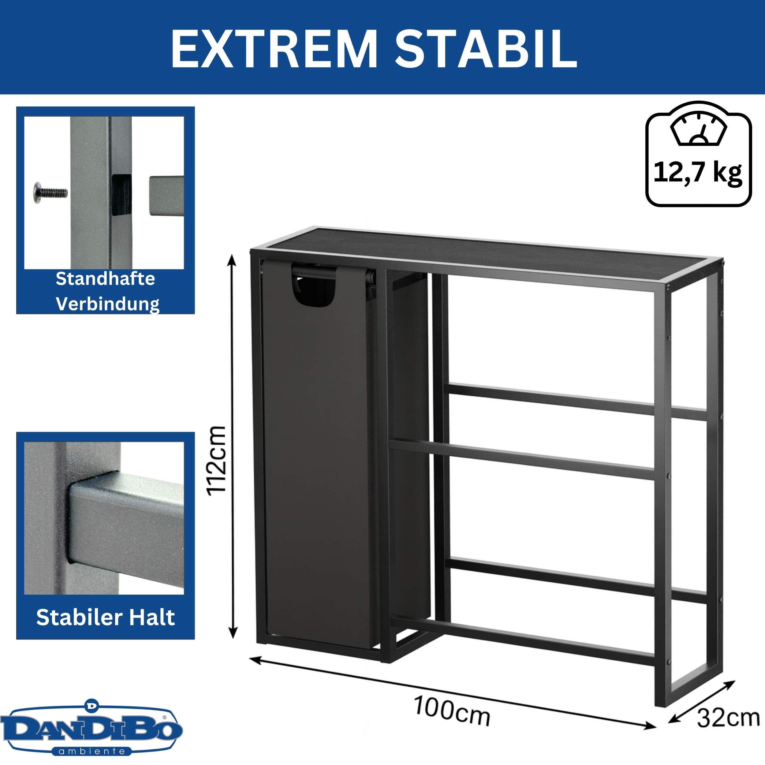 ABMESSUNGEN: Höhe 112 cm, Breite 100 cm, Tiefe 32 cm, Gewicht: 12,7 kg.