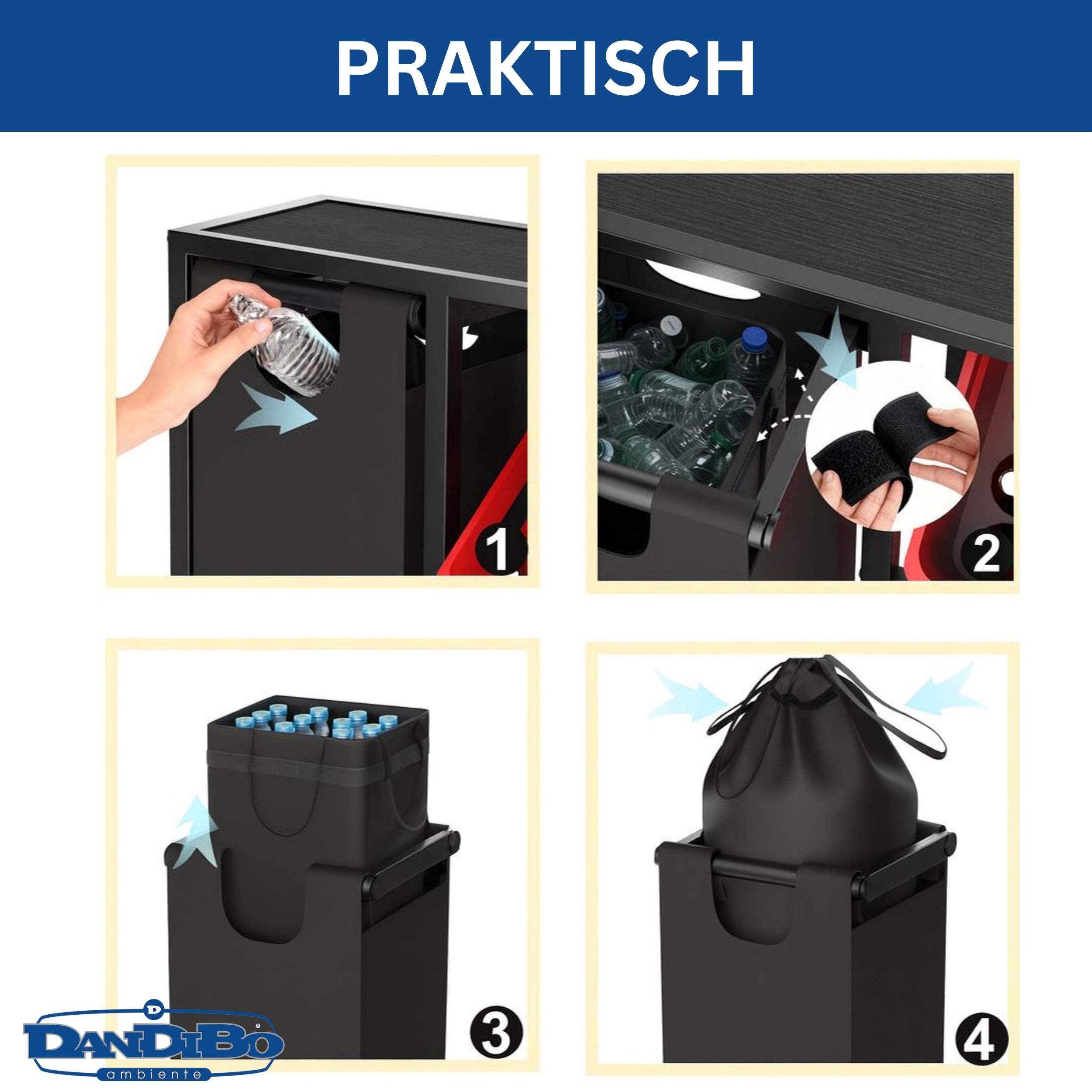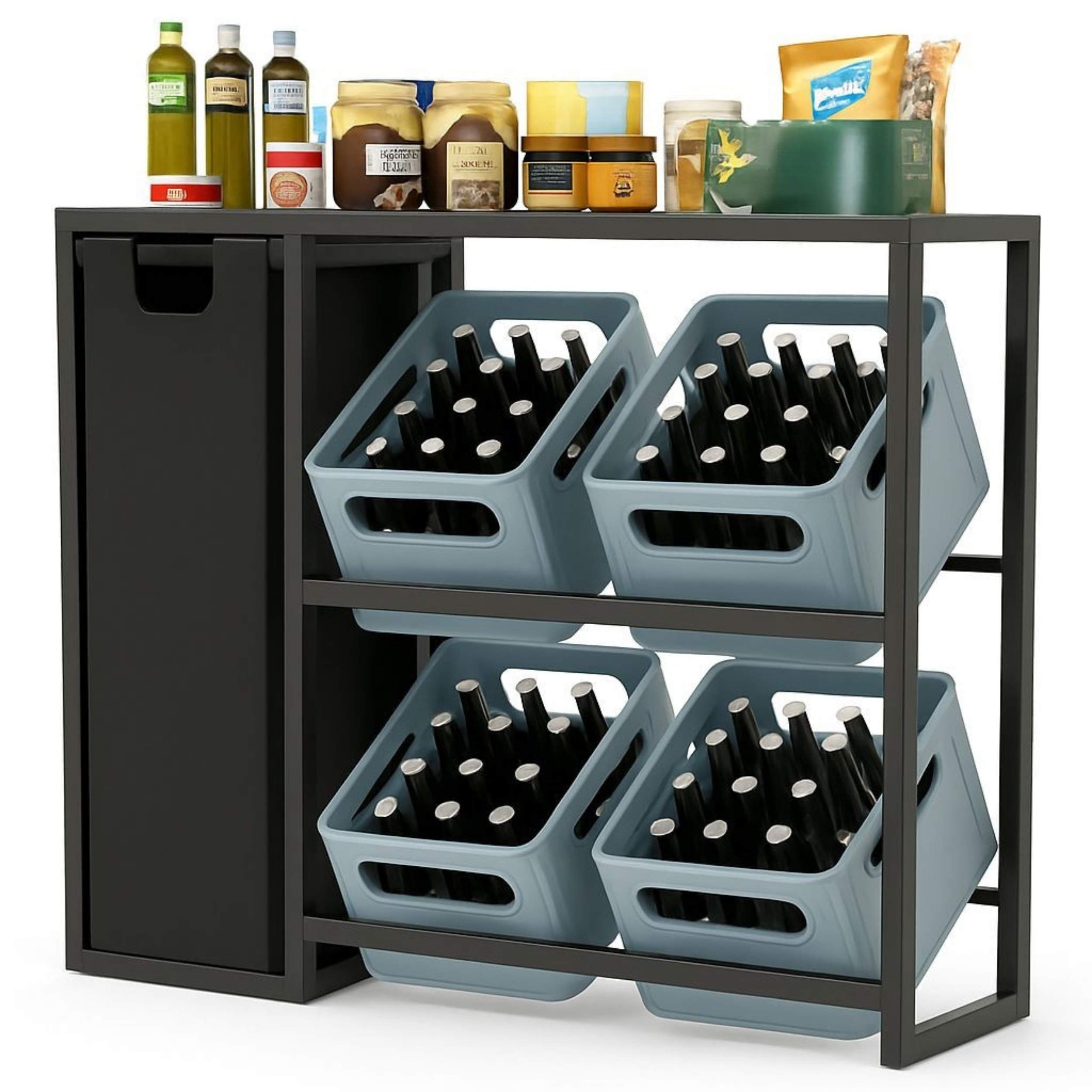 PRAKTISCHER PFANDBEHÄLTER & PLATZ FÜR 4 KISTEN – Seitlich befindet sich ein hoher, herausziehbarer Behälter für leere PET-Flaschen oder Altglas. Auf den beiden Ebenen finden bis zu 4 Getränkekisten übersichtlich Platz. Die obere Ablage eignet sich ideal für Flaschen, Gläser, Snacks oder Grillzubehör.