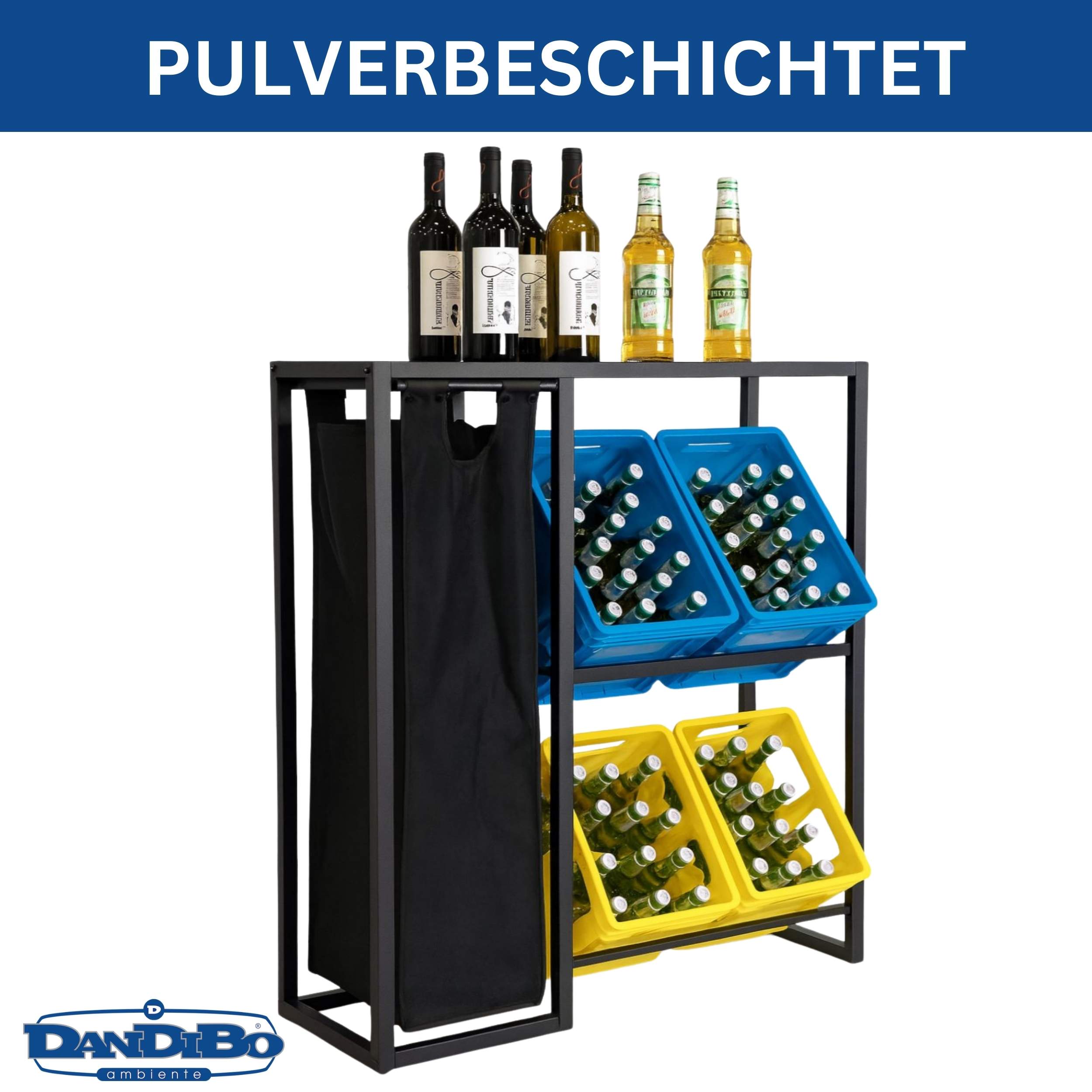 STABILE KONSTRUKTION – Das moderne Getränkekistenregal besteht aus einem robusten Metallgestell mit schwarzer Pulverbeschichtung und einer widerstandsfähigen Ablagefläche. Diese Kombination sorgt für hohe Stabilität, eine edle Optik und eine lange Lebensdauer – perfekt für Küche, Vorratsraum, Terrasse oder Partyecke.