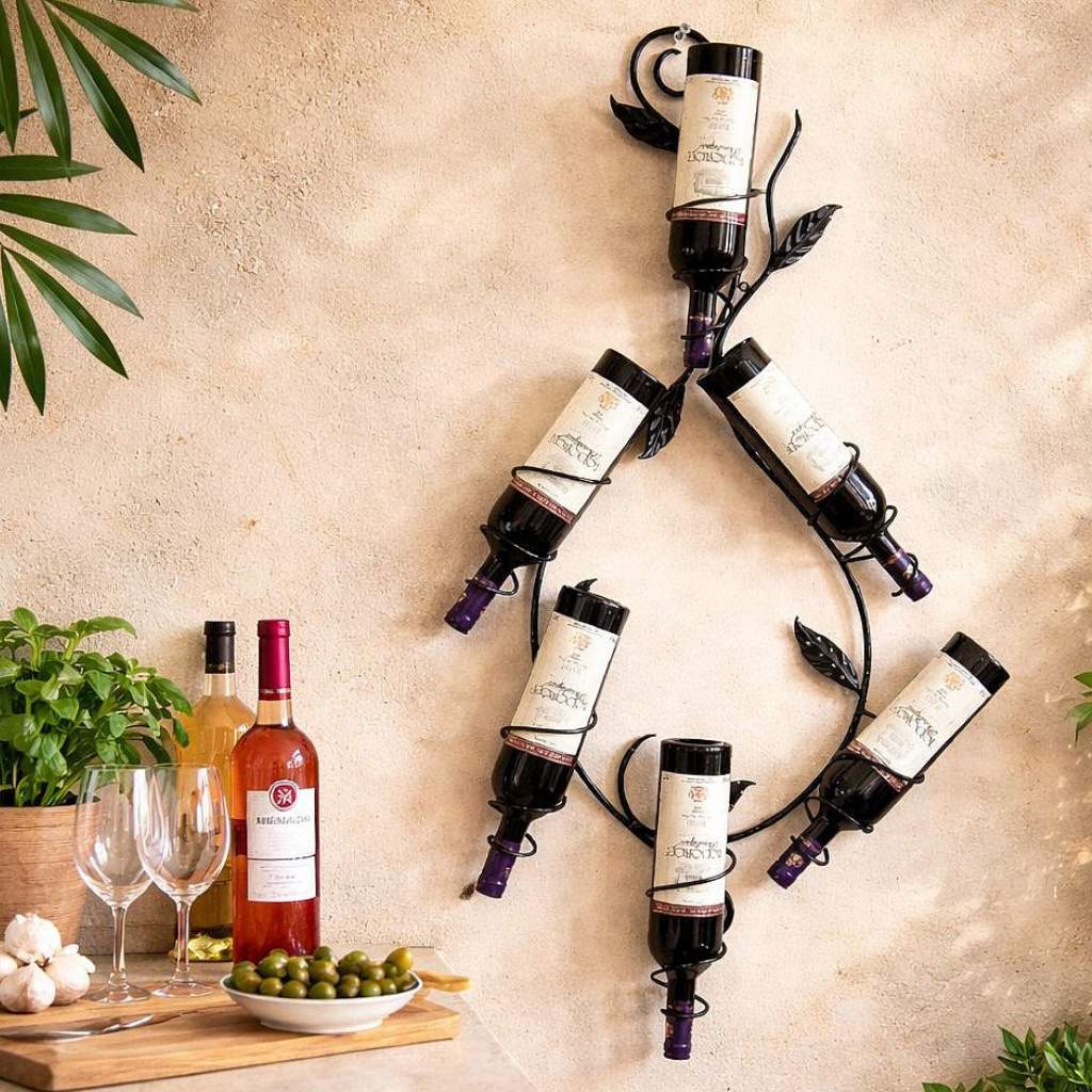 DEKORATIVES WEINREGAL AUS METALL: Dieses stilvolle Wand Weinregal überzeugt durch sein kunstvoll geschmiedetes Design und wird zu einem echten Blickfang in Ihrem Zuhause. Die aufwendig verzierten Ornamente verleihen dem Regal eine elegante und dekorative Ausstrahlung – ideal für Wohnzimmer, Esszimmer oder Küche.