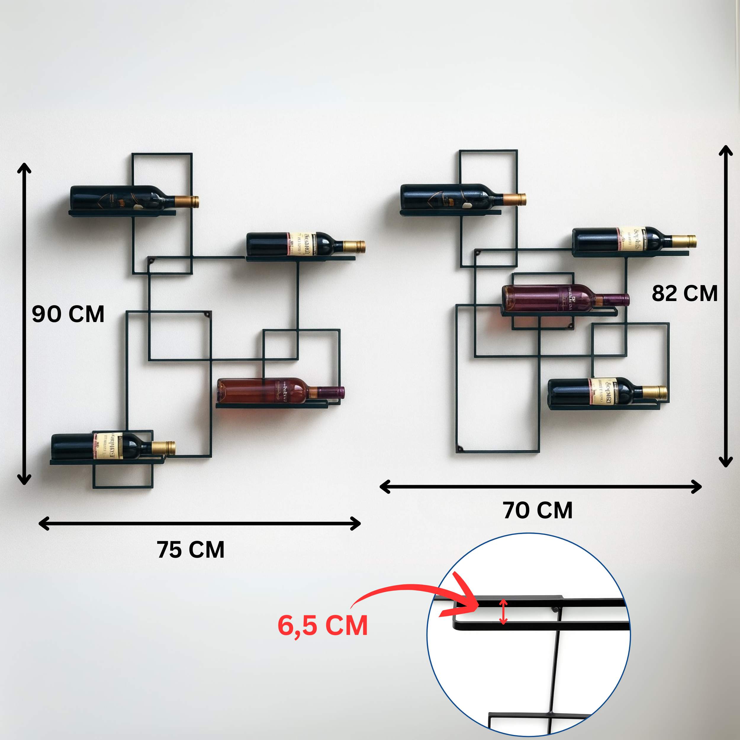 DIMENSIONS: Height 90 cm, Width 75 cm, Depth 10 cm – Material: Metal, Color: Black – Weight: 2 kg – The inner spacing of the bottle holders is 6.5 cm.