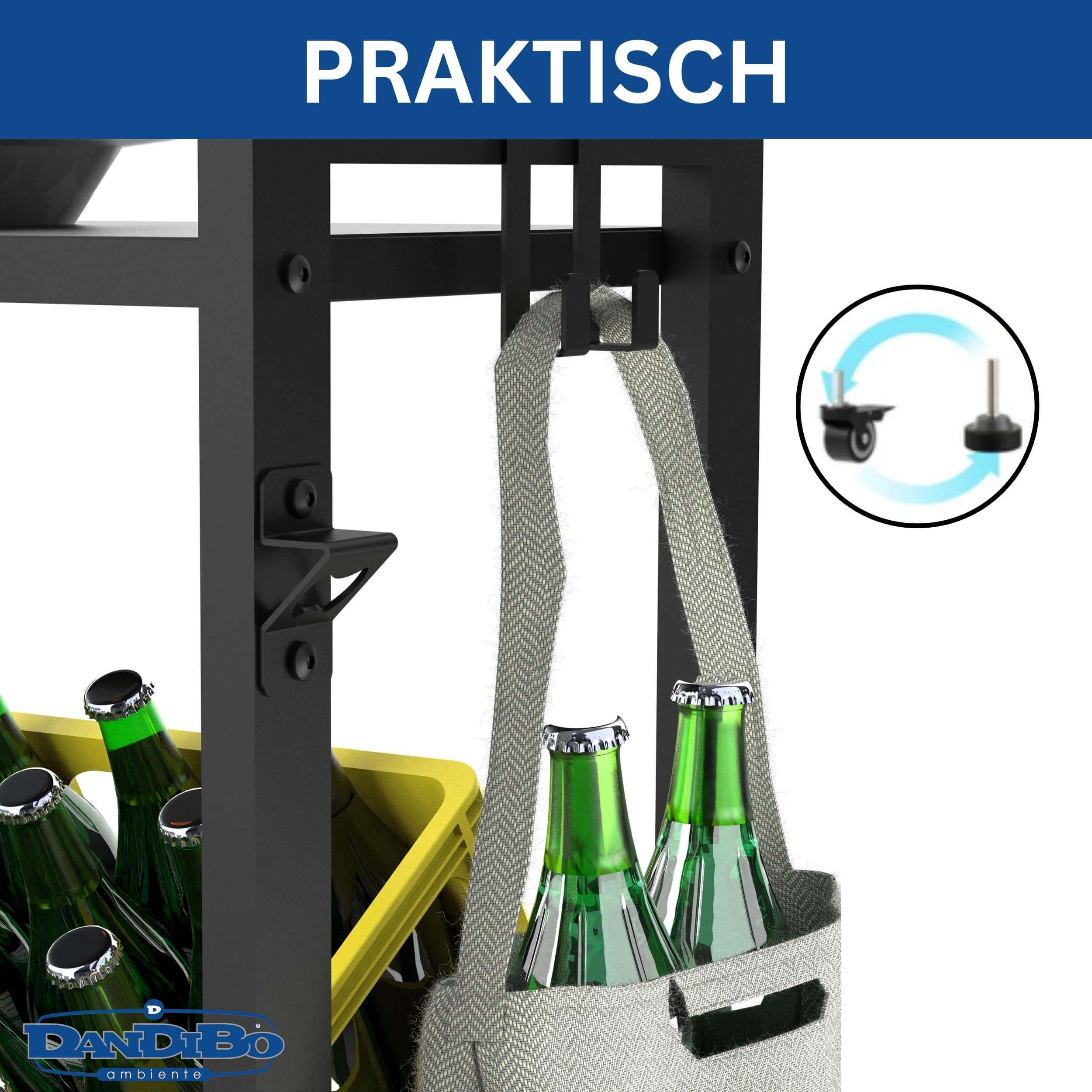 SPACE-SAVING, MOBILE & PRACTICAL – Equipped with 360° swivel wheels with locking function, the rack can be moved effortlessly and fixed safely. An integrated bottle opener and hooks add additional convenience.