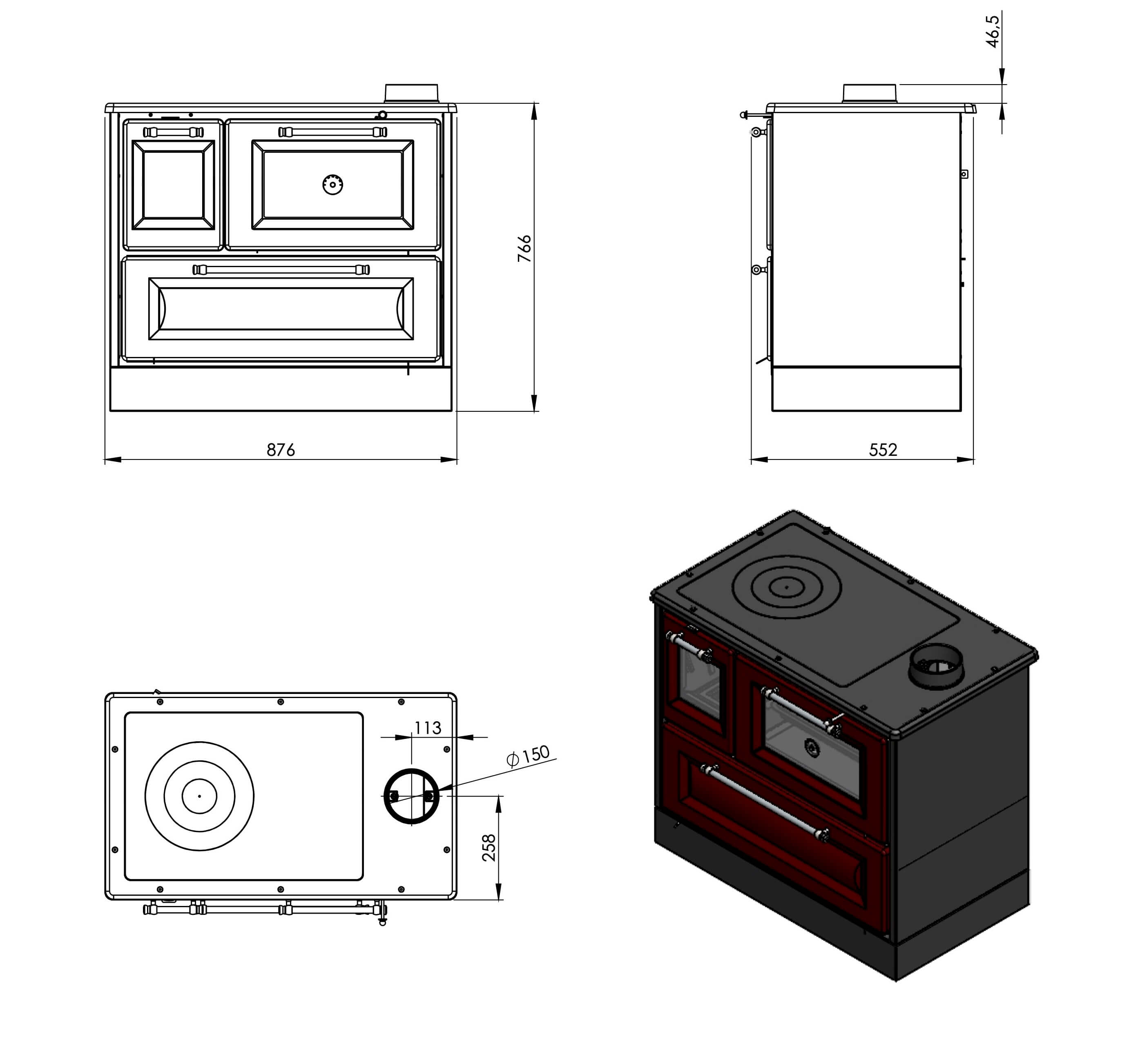 - Rauchrohranschluss: oben, Ø 150 mm
